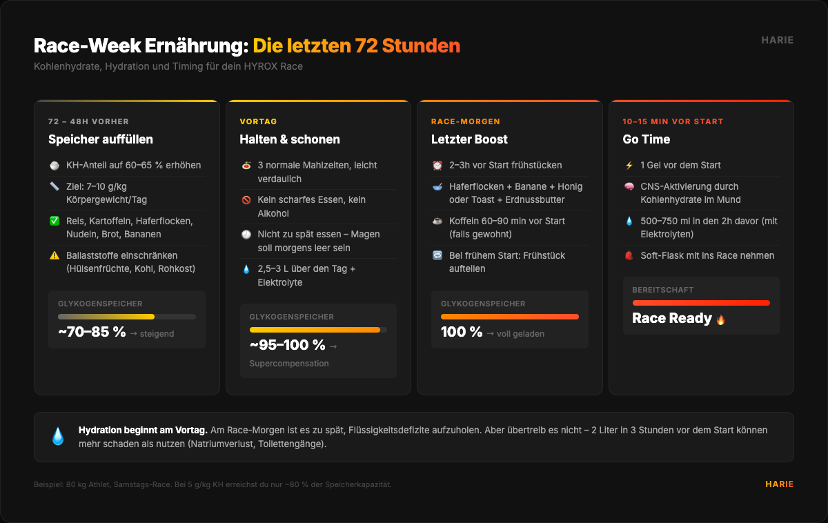 Die komplette Ernährungsstrategie für HYROX: Carboloading ab 48 Stunden vorher, Race-Day-Frühstück, Gels im Wettkampf und warum Elite-Athleten auch unter 60 Minuten Kohlenhydrate nehmen.