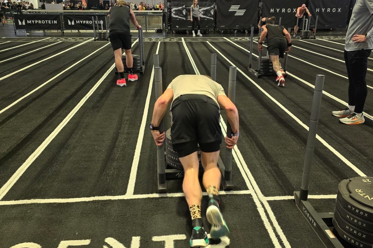 Der komplette Guide zum HYROX Sled Push: Griffpositionen, Körperhaltung, Pausenstrategie, der neue Turf, Benchmark-Zeiten und wie du danach noch laufen kannst.