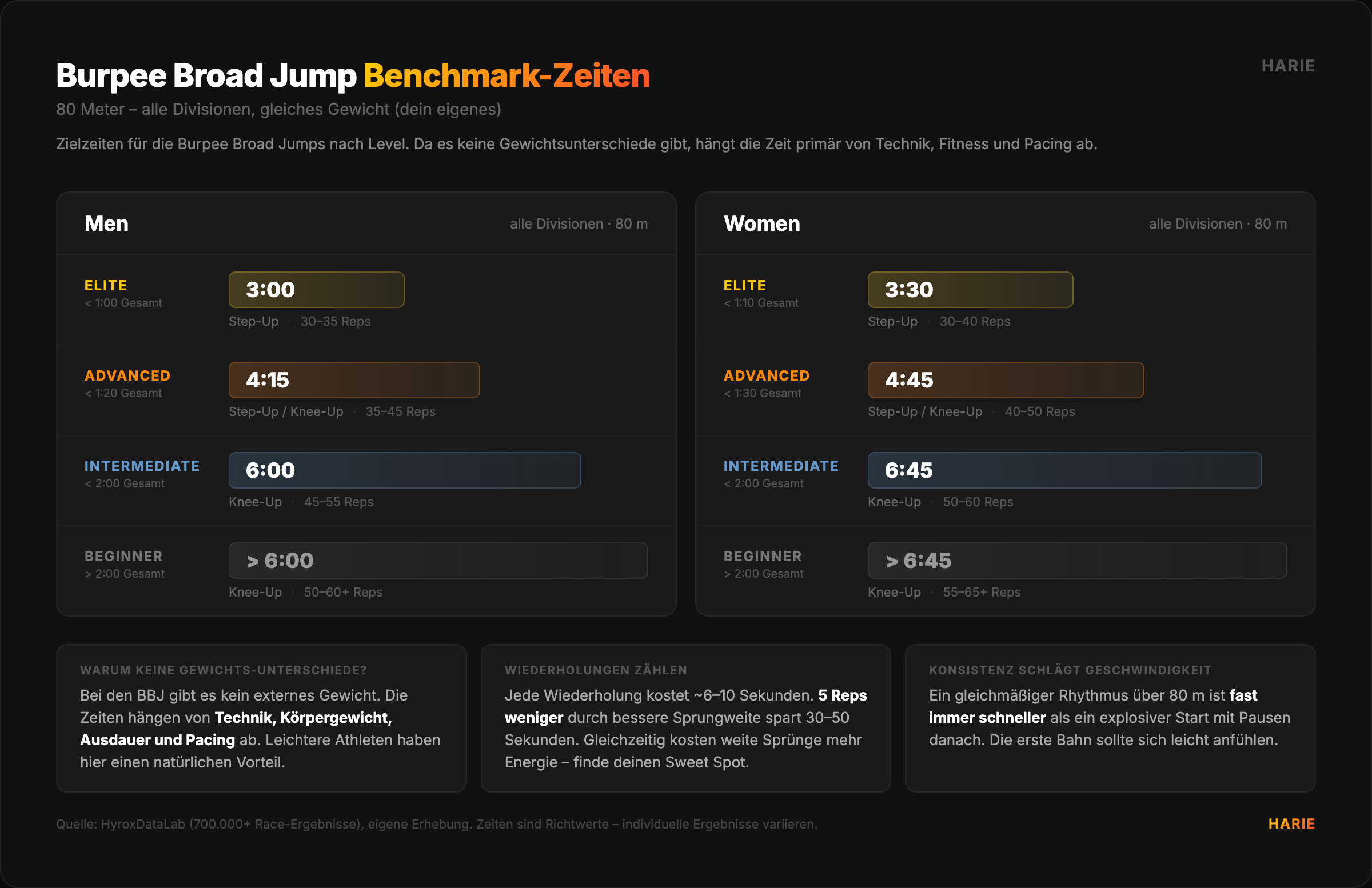 Die Burpee Broad Jumps sind eine Station ohne Gewichtsunterschiede – alle Divisionen machen die gleichen 80 Meter. Die Zeiten variieren daher weniger nach Division und mehr nach Fitnesslevel und Technik. Die durchschnittliche Zeit liegt zwischen 3 und 6 Minuten, abhängig von Erfahrung und Pacing.