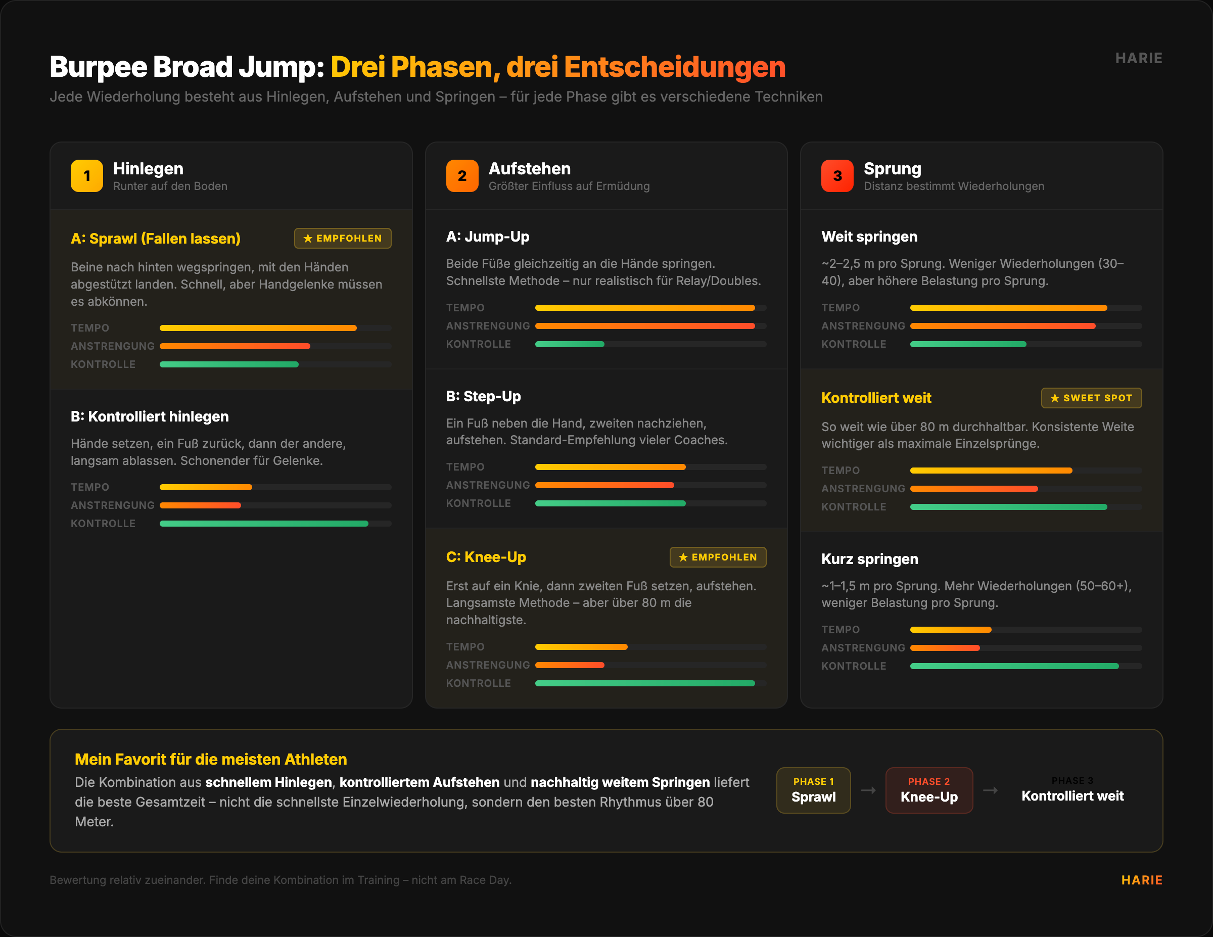 Weit springen: Jeder Sprung bringt dich näher an die 80 Meter. Mehr Distanz pro Sprung = weniger Wiederholungen insgesamt = weniger Burpees. Das spart Zeit. Der Nachteil: weite Sprünge sind anstrengender für die Beine und treiben den Puls hoch. Optimierte Athleten schaffen 30–35 Wiederholungen für die 80 Meter.