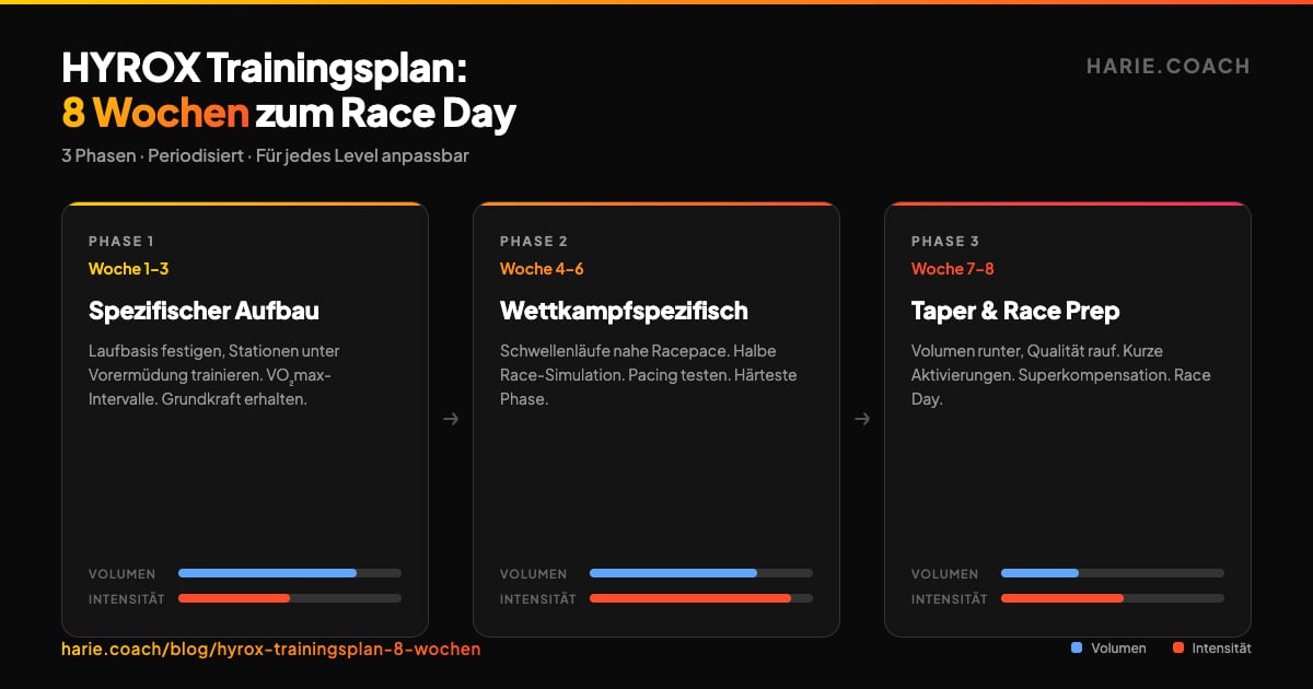 Ein 8-Wochen-Trainingsplan für HYROX mit klarer Periodisierung, Woche-für-Woche-Struktur und Anpassung an dein Level. Vom Grundlagenblock bis zum Tapering.