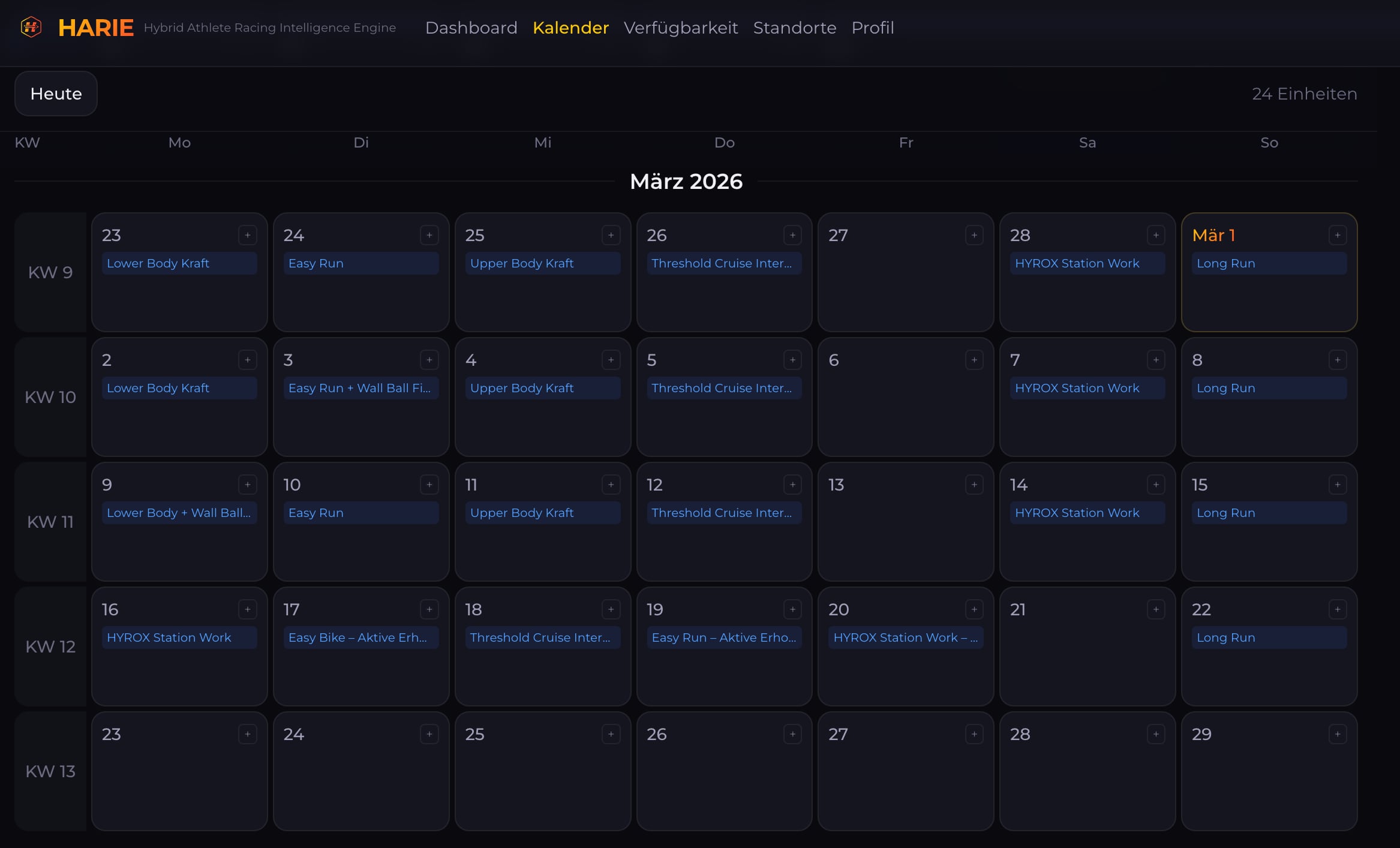 Beachte: Diese Beispielwoche zeigt die Grundlagenphase. In der HYROX-spezifischen Phase (ab Woche 5) kommen kombinierte Einheiten dazu, in denen du Laufen und Stationen verknüpfst – idealerweise in einem HYROX-Gym.