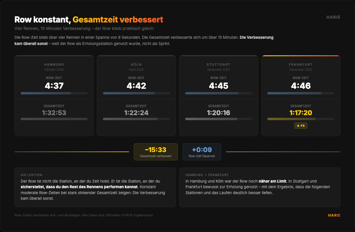 Die Zeiten beinhalten das Auf- und Absteigen. In dieser Spanne verbesserte sich meine Gesamtzeit von 1:32:53 auf 1:17:20. Der Row blieb praktisch gleich – die Verbesserung kam überall sonst. Wobei ich in Hamburg und Köln auf dem Rower noch mehr am Limit war als in Stuttgart und Frankfurt. Und genau das ist der Punkt: Der Row soll dafür sorgen, dass du bei allen anderen Stationen performen kannst.