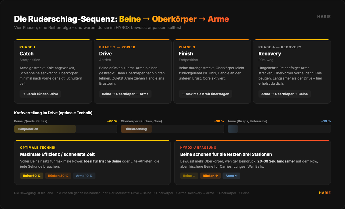 Hier kommt der HYROX-spezifische Aspekt: Wenn du die schnellstmögliche Row-Zeit willst, erledigst du die Hauptarbeit mit den Beinen – vor allem mit den Quads. Das ist die effizienteste Technik.