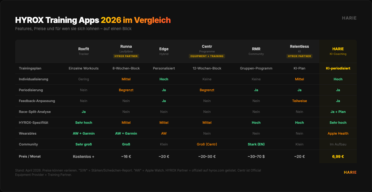 | Kriterium | Roxfit | Runna | Edge | Centr | RMR | Relentless | HARIE |