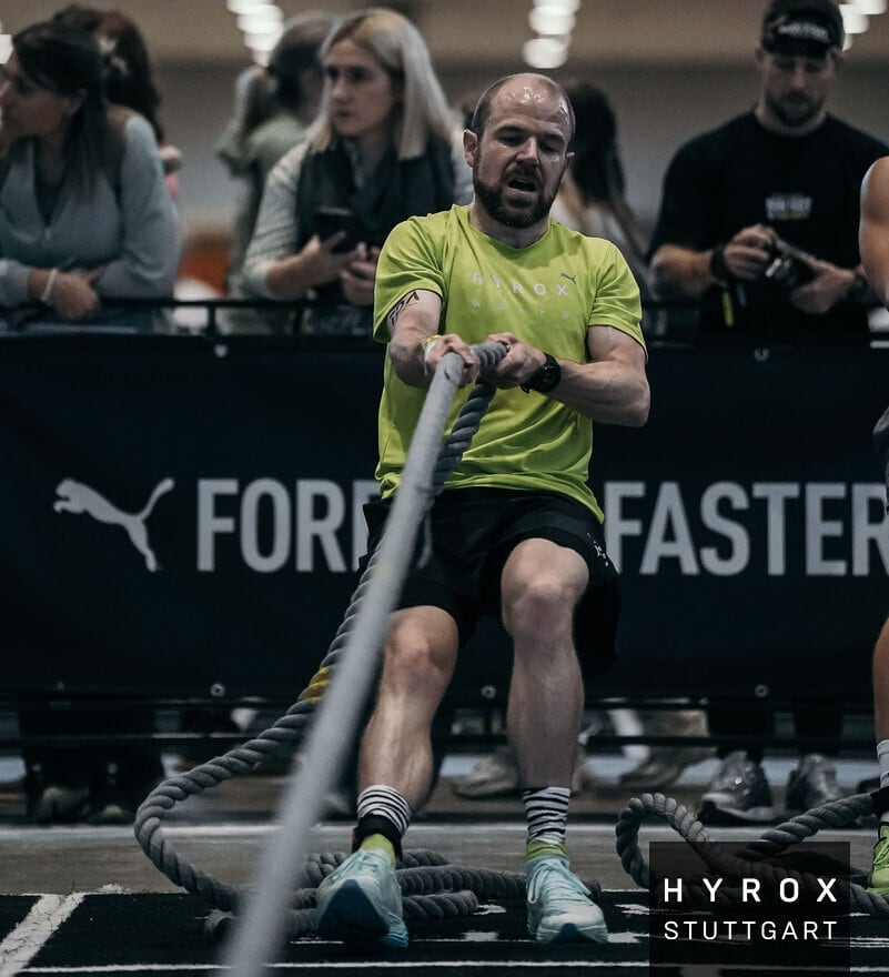 Kann ich den Plan mit einem Gruppen-HYROX-Kurs kombinieren? Ja, aber zähle den Kurs als eine deiner Trainingseinheiten. Ersetze zum Beispiel die Kombi-Einheit am Tag 5 durch den Gruppen-Kurs. Nicht zusätzlich obendrauf packen – das führt schnell zu Übertraining.